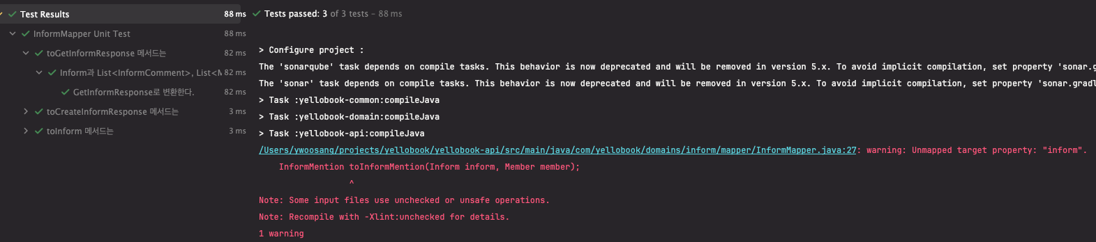 ./gradlew clean 후 실행시키면 테스트는 통과하지만 Unmapped target property 경고가 발생한다. 전체 객체가 아닌 특정 필드를 매핑하는 경우 이름이 같을 때 @Mapping이 불필요하지만, 전체 객체를 매핑할 때는 매핑 규칙을 설정하지 않으면 경고가 발생한다.