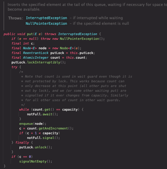 void put(E e) throws InterruptedException