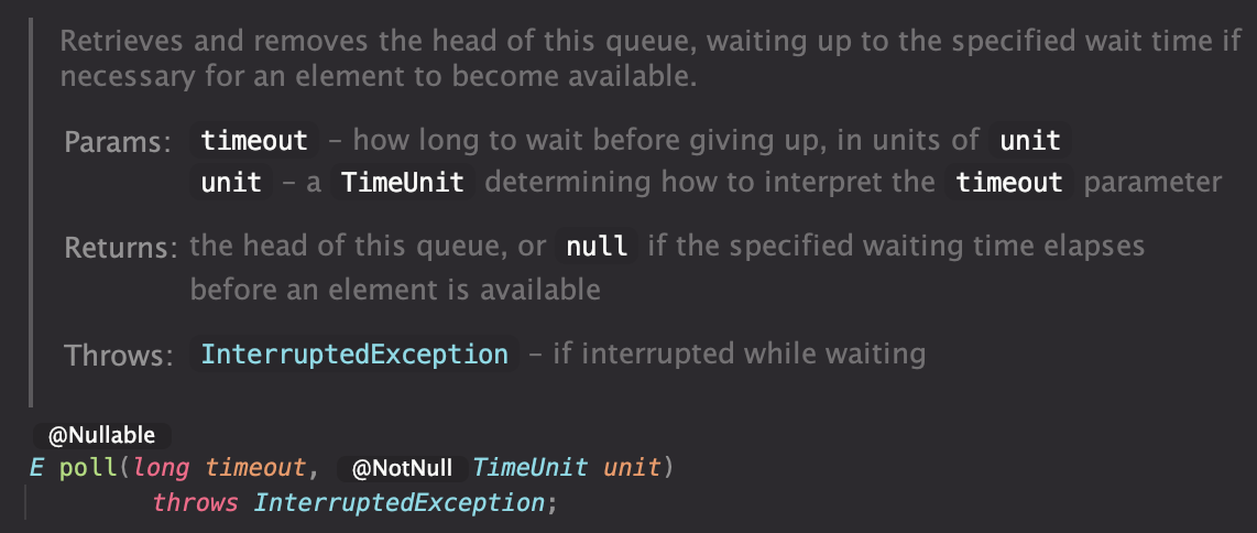 E poll(long timeout, TimeUnit unit) throws InterruptedException;