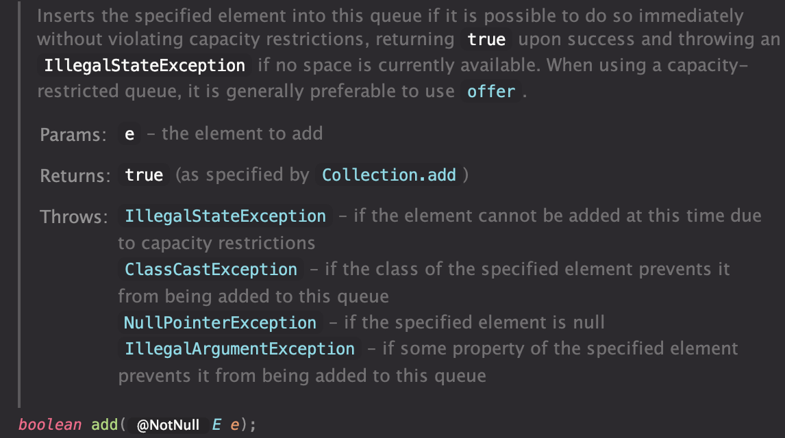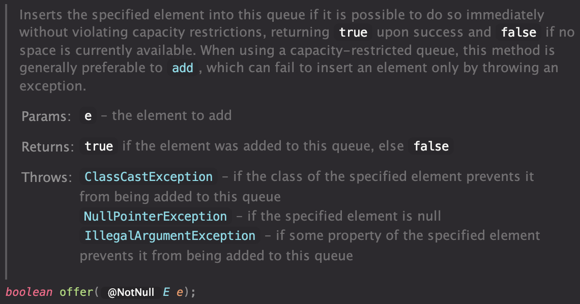 - 용량이 제한되어 있다면 offer() 를 사용하는 것이 권장된다.