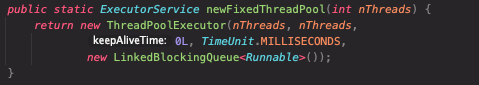 쓰레드풀을 이용할 때 사용되는 Executors 클래스에서 고정된 쓰레드풀의 개수를 반환하는 newFixedThreadPool 이 ThreadPoolExecutor 인스턴스를 생성해 반환하는데, ThreadPoolExecutor 에서 BlockingQueue 를 파라미터로 받아 이용하고 있다. (기본적으로 LinckedBlockingQueue 가 사용된다.)
