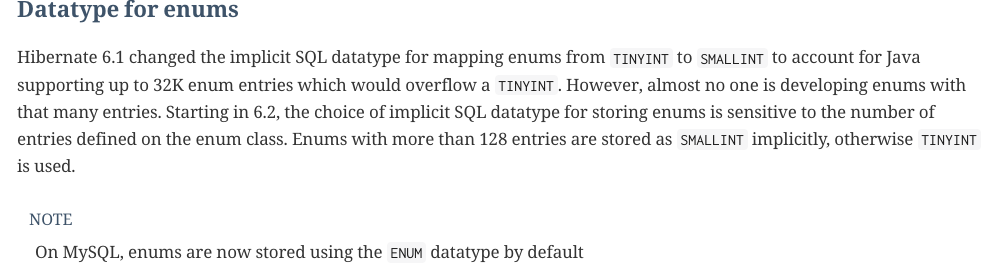 Hibernate 6.2 부터는 ENUM 데이터타입 매핑이 기본값으로 변경되었다.