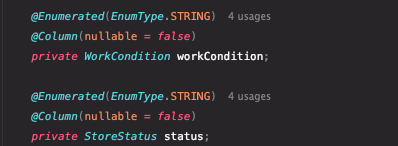 따라서, ENUM 은 확장성이 제한되므로 VARCHAR 로 처음부터 설계하거나, 아예 별도 테이블로 분리해서 FK 참조를 하는 방식을 이용하는게 더 나을 것 같다. VARCHAR 로 저장하려면 아래처럼 columnDefinition 을 활용하는 방법이 제일 나아보인다.