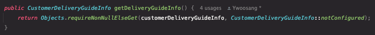 고객 주소지 엔티티의 getter 에서 고객이 배달안내정보를 설정하지 않은 경우, 위에서 만든 메서드를 호출해, 설정되지 않은 주소지 객체를 반환한다.