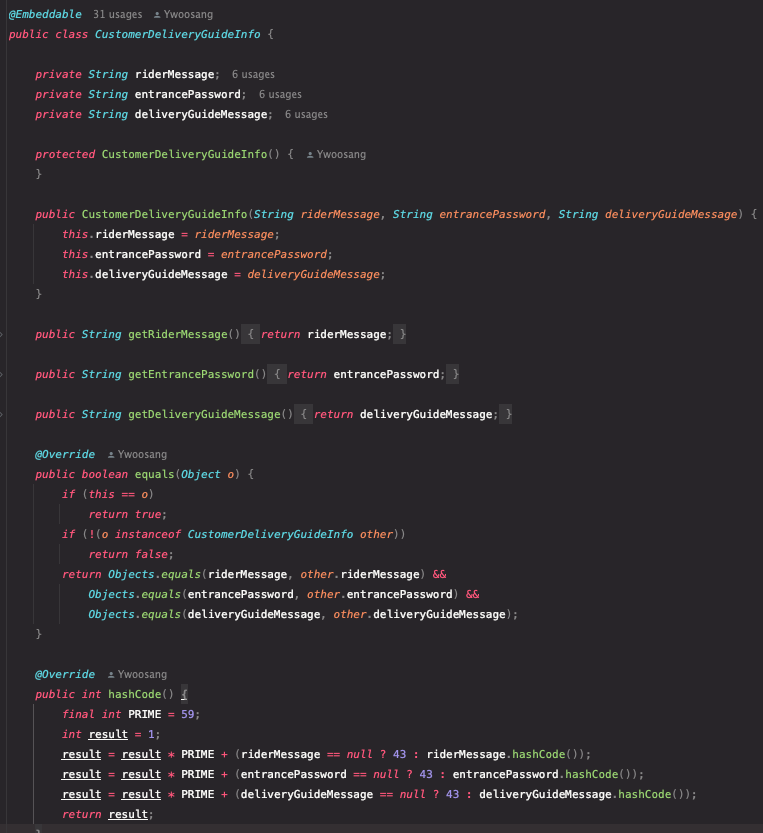 고객 주소 엔티티에서 배달 정보에 대한 관련된 값들을 묶기 위해 아래 VO 를 만들어서 사용하고 있다.