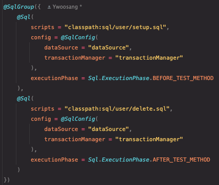 해당 이슈는 통합테스트에서 잡을 수 있었다. 테스트에서는 아래처럼 @SqlGroup 을 두고 setup.sql 로 초기 데이터를 집어넣고 있다. schema 는 flyway 를 사용하고 있으므로, migration script 가 적용받도록 그대로 두고 setup 과 delete 만 각각 sql 파일만 구성했다.