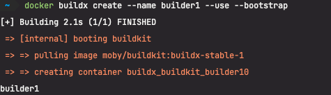 docker buildx create 로 빌더를 만든다. 기본적으로 --driver 옵션을 붙이지 않으면 docker-container 빌더가 자동 선택된다.