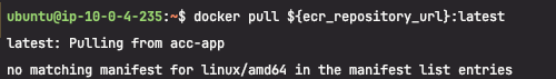 예시로 MAC 에서 Docker 이미지 빌드 환경은 ARM64 기반이다. 하지만 우리가 실제로 배포하는 서버는 대부분 AWS EC2와 같은 x86_64 기반 환경이므로 이로 인해 로컬(Mac)에서 만든 이미지를 AWS에 배포했을 때 아래와 같이 호환성 문제가 발생한다.