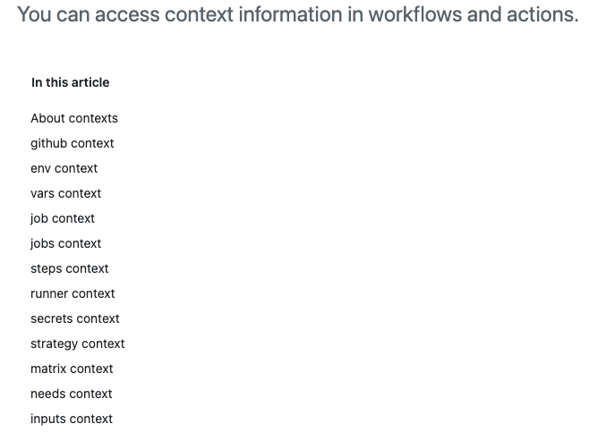 - https://docs.github.com/en/actions/writing-workflows/choosing-what-your-workflow-does/accessing-contextual-information-about-workflow-runs#context-availability